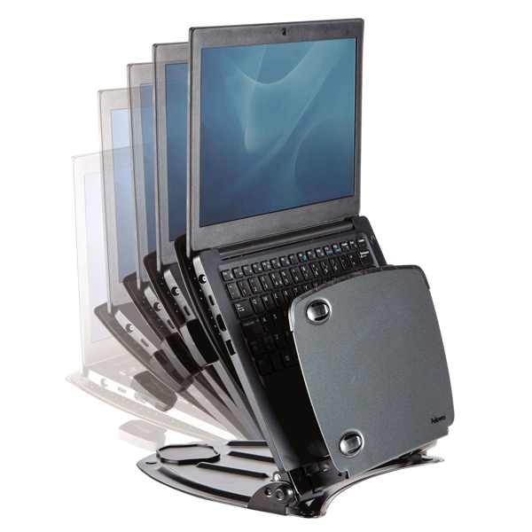 Robustní kovový stojan na notebook vhodný pro zařízení až do 17" a 6,8 kg nabízí 10 nastavitelných výšek v rozmezí 38–254 mm, takže si snadno nastavíte ideální ergonomii práce. Součástí je také držák na dokumenty a čtyři vestavěné USB 2.0 porty pro snadné připojení periferií. Stojan je kompatibilní s dokovací stanicí, rychle sestavitelný bez nářadí, složitelný naplocho a v elegantním černém provedení – ideální kombinace funkčnosti a stylu pro vaši kancelář.